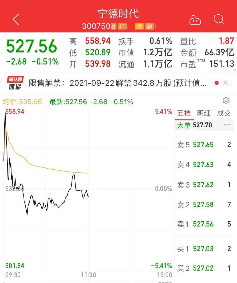上半年業(yè)績暴增的電池龍頭、超萬億市值的寧德時代(300750),在發(fā)布半年報后,今日上午高開后股價走低,上午收綠。