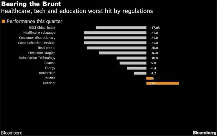 摘要: 今年來,中國資本市場上游戲、課后輔導(dǎo)、醫(yī)療健康、白酒等多個行業(yè)的股票大幅回調(diào)。如下圖所示,自6月30日以來,跌幅居前的板塊包括通信服務(wù)、非必需消費品及健康醫(yī)療,這三個板塊分別暴跌21%,