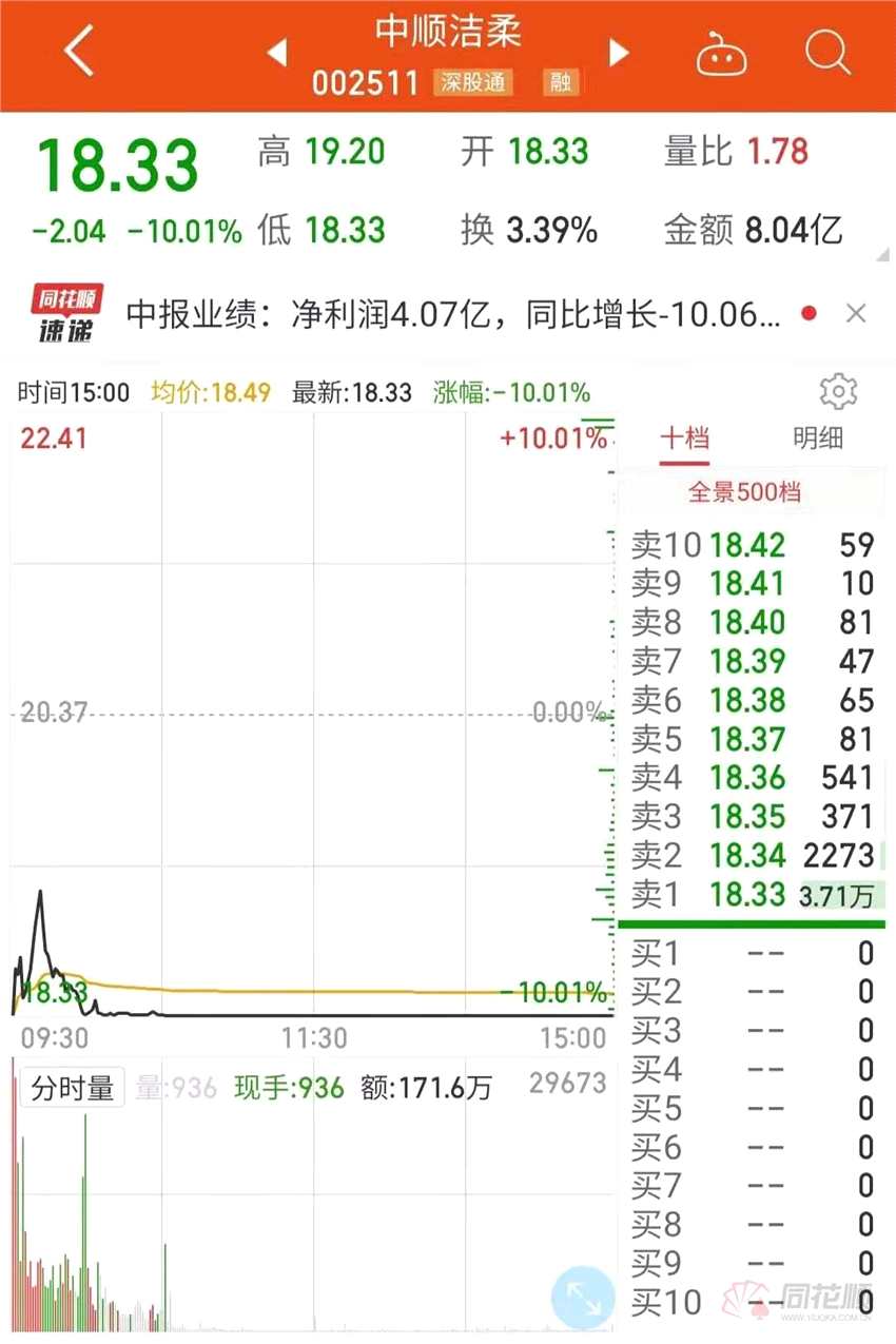 無(wú)獨(dú)有偶,今日另外一只消費(fèi)大白馬,中順潔柔(002511)也因業(yè)績(jī)慘遭跌停。與海天味業(yè)走勢(shì)類似,該股開盤后經(jīng)歷短暫沖高,隨后重新回封跌停。
