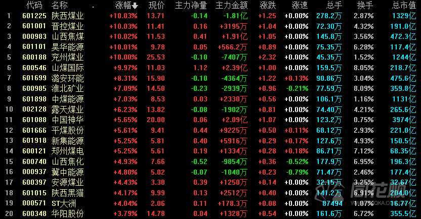 個(gè)股方面,鄂爾多斯(600295)、山煤國(guó)際漲停,山西焦煤、陜西煤業(yè)、晉控煤業(yè)(601001)、華陽(yáng)股份(600348)漲超7%,潞安環(huán)能(601699)、【廣匯能源(600256)、股吧】(600256)、中國(guó)神華(601088)等跟漲。