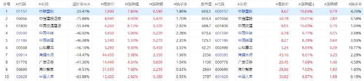 以A股收盤時間,AH股漲幅前10如下: