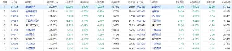 贛鋒鋰業(yè)(002460)A股跌停,H股跌6.08%;福萊特(601865)A股跌7.42,H股跌8.70%。