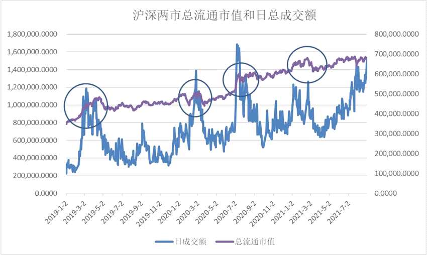 這是因?yàn)槿粘山活~的放大并不是股市上漲的根本原因,只是表象之一。從歷史數(shù)據(jù)來看,成交額的持續(xù)放大往往伴隨著市場上漲,總流通市值的增加,增量資金進(jìn)場。如下圖所示,例如2019年初的市場,2020年初的市場,2020年七月份的市場和2021年初的市場,都存在增量資金進(jìn)場,使總流通市值增加,并帶來的日成交額的持續(xù)放大。