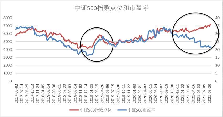 出現(xiàn)分化的局面主要是因?yàn)橹行∈兄瞪鲜衅髽I(yè)自去年下半年以來盈利能力的持續(xù)提升,在2019年初中證500的上漲中,明顯可以看到中證500的市盈率漲幅明顯大于指數(shù)點(diǎn)位的漲幅(如下圖所示),盈利能力不足以支撐指數(shù)點(diǎn)位,隨后在19年二三季度中證500下跌回歸估值水平。與過去不同的是,去年7月以來,中證500盈利能力持續(xù)增強(qiáng),估值PE持續(xù)下降。在我國經(jīng)濟(jì)轉(zhuǎn)向高質(zhì)量發(fā)展階段,加上中央對“專精特新”公司的政策扶持和重視,未來將有更多的“小巨人”公司上市并加入中證500樣本股(“專精特新”公司絕大多數(shù)均為中小市值企業(yè),大概率都落在中證500(或中證1000)的樣本區(qū)間),所以從長期來看中證500(或中證1000)指數(shù)持續(xù)跑贏滬深300和上證50是可能是大概率事件。