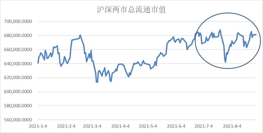 通過觀察滬深兩市總流通市值變化,近期連續(xù)高成交額的情況下并沒有帶來總流通市值的增長,也沒有明顯的增量資金進(jìn)場(如下圖所示),近期的高成交額只不過是存量資金的博弈結(jié)果。