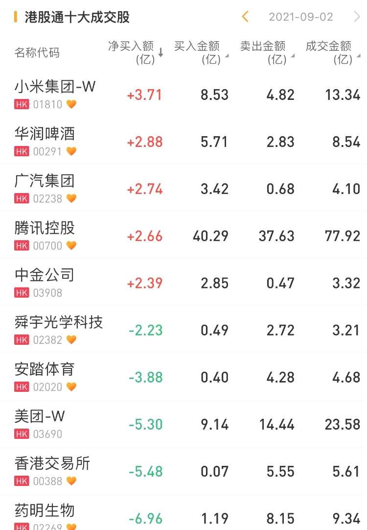 個(gè)股方面,今日南下資金凈買入小米3.71億港元,為今日買入之最。此外,華潤(rùn)啤酒獲南下資金買入2.88億港元。