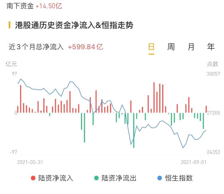 南下資金今日凈流入港股14.50億港元,昨日凈流入15.99億港元。