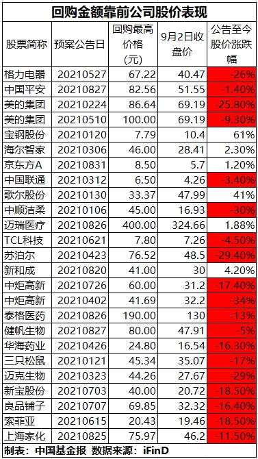 據(jù)基金君統(tǒng)計,兩市回購金額居前的23家公司有17家在董事會回購預(yù)案推出后至今股價錄得下跌,占比超過七成,其中跌幅比較深的個股包括中炬高新、【蘇泊爾(002032)、股吧】(002032)、美的集團、格力電器、索菲亞(002572)、華海藥業(yè)(600521)、良品鋪子(603719)等,跌幅在15%-35%不等。