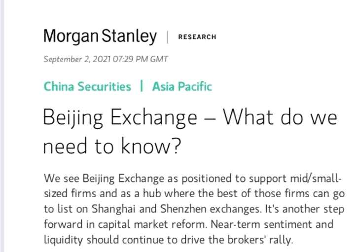 摩根士丹利9月2日就北京證券交易所設(shè)立緊急發(fā)表研究報告指出,北京證券交易所的設(shè)立是為了扶持中小型企業(yè)發(fā)展。未來,北京證券交易所一部分優(yōu)質(zhì)公司可能會轉(zhuǎn)到滬深交易所上市。摩根士丹利解讀認(rèn)為設(shè)立北京證券交易所是中國資本市場改革深化的舉措,是中國多層次資本市場建設(shè)的一部分,也是中國資本市場注冊制改革的一部分,有助于資本市場發(fā)揮直接融資功能。