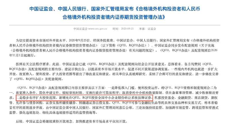 2020年9月,中國證監(jiān)會、中國人民銀行、國家外匯管理局發(fā)布《合格境外機構(gòu)投資者和人民幣合格境外機構(gòu)投資者境內(nèi)證券期貨投資管理辦法》,即QFII新規(guī)。新規(guī)拓寬了QFII的投資范圍,新增允許QFII、RQFII投資全國中小企業(yè)股份轉(zhuǎn)讓系統(tǒng)掛牌證券等。QFII投資新三板股票原則上已無政策性障礙。