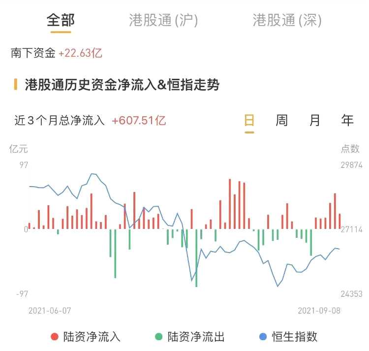 南下資金今日凈流入港股22.63億港元,昨日凈流入21.41億港元。