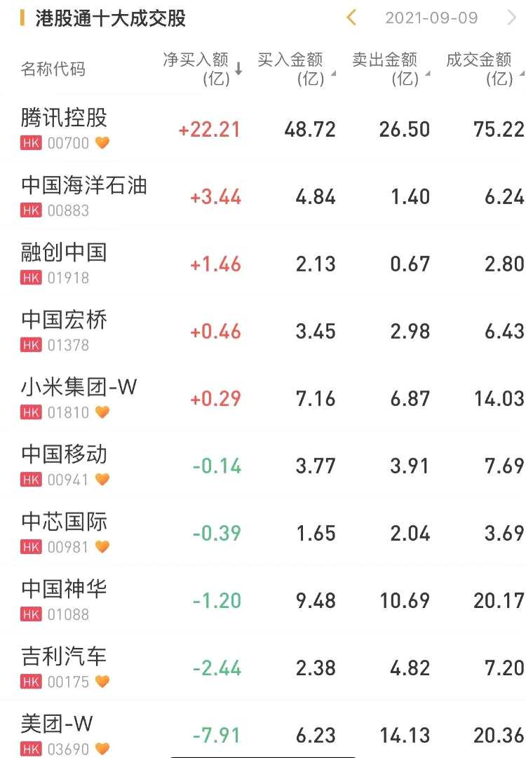 南下資金凈買入騰訊22.21億港元,為今日買入之最。此外,中國海洋石油獲南下資金買入3.44億港元。