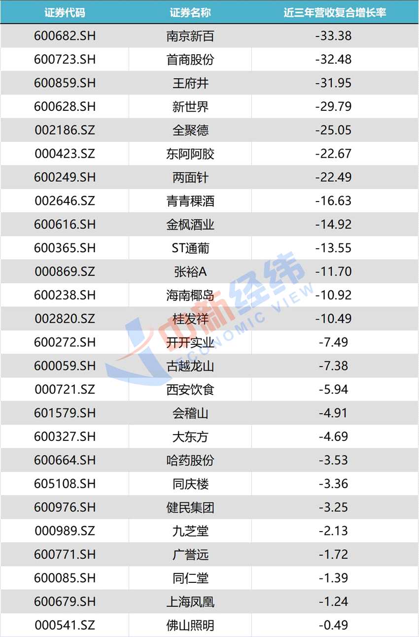 A股26家老字號概念股近三年營收復(fù)合增長率為負(fù)。數(shù)據(jù)來源:同花順iFinD
