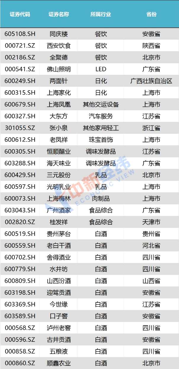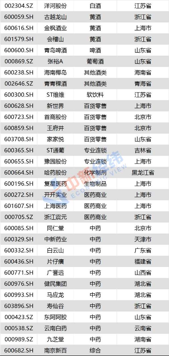 分行業(yè)來看,酒企居多,共21家,其中白酒企業(yè)13家,貴州茅臺、五糧液、山西汾酒、瀘州老窖等都是老字號;其次是醫(yī)藥類企業(yè),共16家,包括哈藥股份、東阿阿膠、云南白藥、【廣譽遠(yuǎn)(600771)、股吧】、馬應(yīng)龍等。