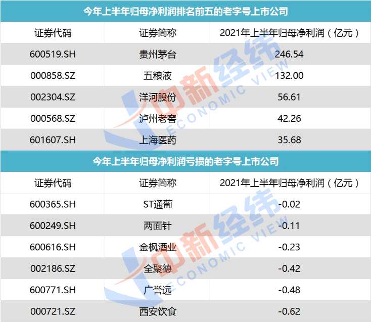 歸母凈利潤方面,貴州茅臺、五糧液今年上半年分別實現(xiàn)歸母凈利潤246.54億元、132億元,在61家老字號上市公司中遙遙領(lǐng)先;此外也有6家老字號上半年歸母凈利潤虧損,分別為ST通葡、兩面針、金楓酒業(yè)、全聚德、廣譽遠(yuǎn)、【西安飲食(000721)、股吧】。