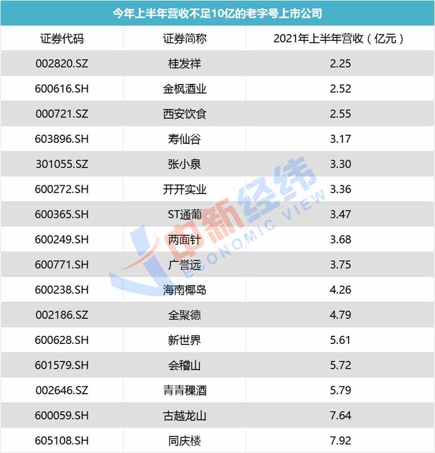以2021年半年報數(shù)據(jù)為例,有營收超千億者,如上海醫(yī)藥,上半年實現(xiàn)營收1052.37億元;貴州茅臺、五糧液、白云山、老鳳祥、豫園股份等13家企業(yè)上半年營收超百億。也有16家企業(yè)今年上半年營收不足10億元,如全聚德、兩面針、桂發(fā)祥、海南椰島、廣譽遠(yuǎn)等。