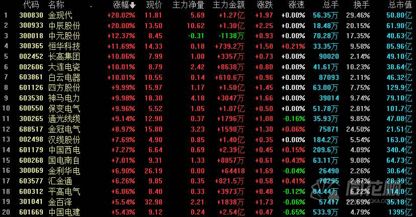 特高壓概念早盤開盤走高,截至午盤板塊漲幅約3.5%,板塊中【金現(xiàn)代(300830)、股吧】(300830)、中辰股份(300933)20CM漲停,中元股份(300018)、恒華科技(300365)等跟漲。