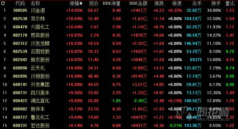 9月13日,受商品現(xiàn)貨漲價(jià)刺激,磷化工概念高開高走,午后磷化工概念繼續(xù)持續(xù)走高,截至發(fā)稿板塊漲幅位居板塊漲幅榜首位,漲幅超過6%。個(gè)股方面,四川美豐(000731)于早盤率先漲停,之后龍頭云天化(600096)也沖高封板,帶動(dòng)板塊個(gè)股紛紛走強(qiáng)。截至發(fā)稿,六國化工(600470)、芭田股份(002170)、【川發(fā)龍蟒(002312)、股吧】(002312)等多只個(gè)股漲停,漲停家數(shù)超過10只。