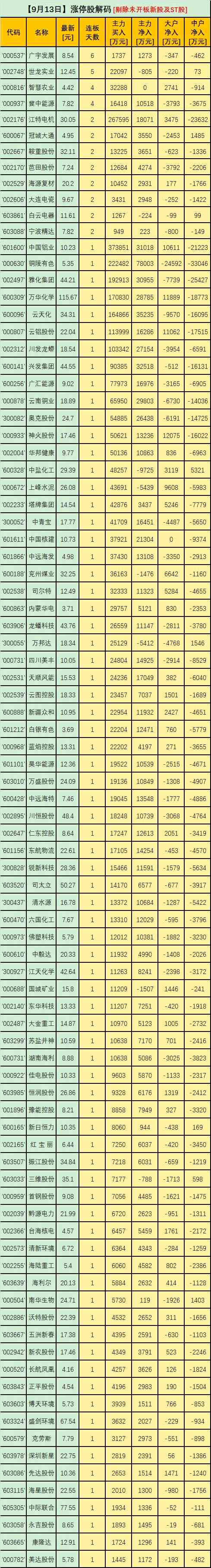 9月13日,截止A股收盤,剔除未開(kāi)板新股及ST股后,兩市漲停股主力解碼詳見(jiàn)下表。