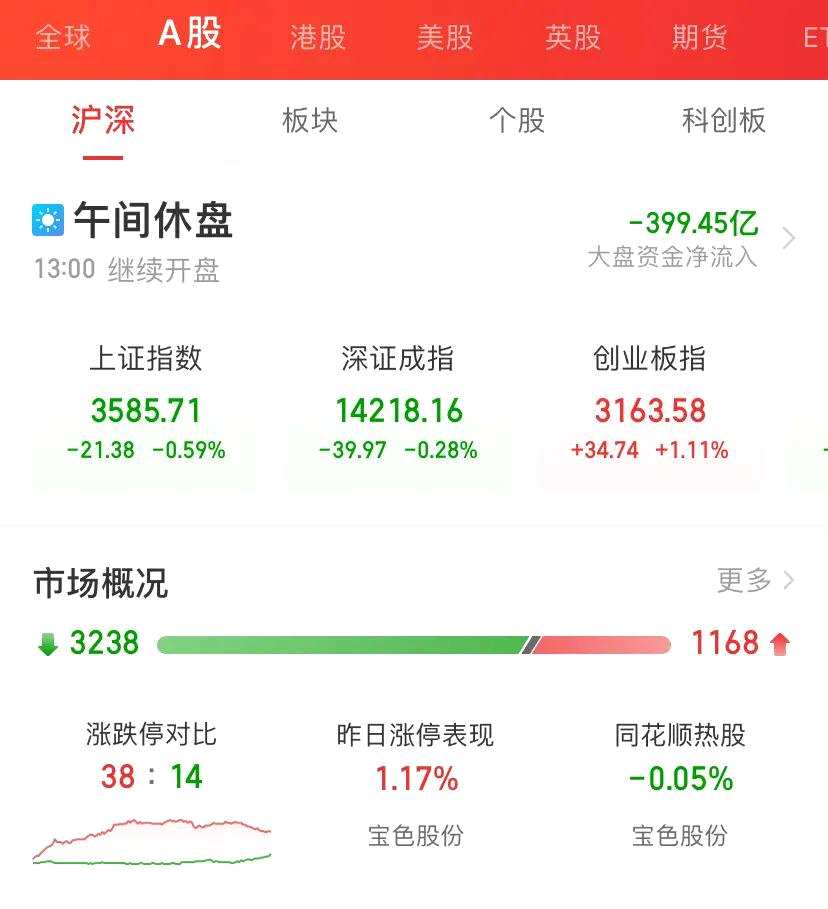 市場仍是分化行情。上午收盤,上證指數(shù)跌0.59%,深證成指跌0.28%,創(chuàng)業(yè)板指數(shù)漲1.11%,科創(chuàng)50指數(shù)跌0.83%,個股1168個上漲,3238個下跌,兩市成交額8436億元。