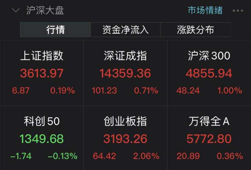 截至收盤,滬指漲0.19%,報(bào)3613.97點(diǎn);深成指漲0.71%,報(bào)14359.36點(diǎn);創(chuàng)業(yè)板指漲2.06%,報(bào)3193.26點(diǎn)。兩市合計(jì)成交13431億元,兩市成交額已連續(xù)第43個(gè)交易日超過1萬億,追平2015年創(chuàng)下的歷史紀(jì)錄。