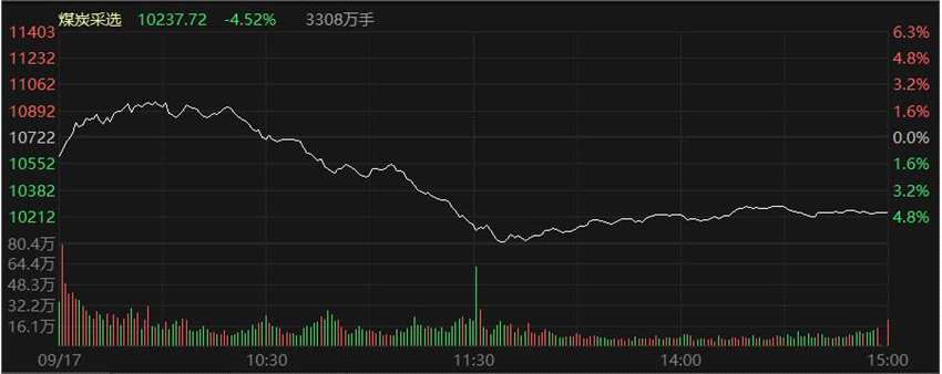 9月17日,煤炭開采概念低開上行,紅盤承壓后跳水跌綠,板塊午后觸底后回調(diào)整理,收跌4.52%,其中冀中能源(000937)、晉控煤業(yè)(601001)跌停。