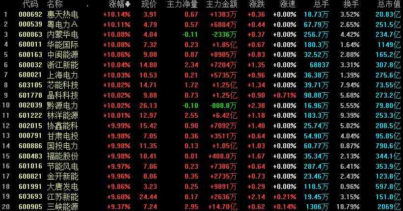 中秋節(jié)后首個(gè)交易日,電力板塊延續(xù)上周強(qiáng)勢(shì),掀起漲停潮。截至午盤,板塊漲幅近6%,板塊中惠天熱電(000692)、【粵電力A(000539)、股吧】、內(nèi)蒙華電(600863)、華能國(guó)際(600011)、中閩能源(600163)、浙江新能(600032)等多股漲停。