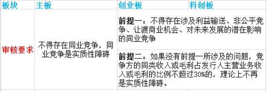 主板要求,發(fā)行人與控股股東、實(shí)際控制人及其控制的其他企業(yè)間不存在同業(yè)競爭。創(chuàng)業(yè)板、科創(chuàng)板要求,發(fā)行人與控股股東、實(shí)際控制人及其控制的其他企業(yè)間不存在對(duì)發(fā)行人構(gòu)成重大不利影響同業(yè)競爭。