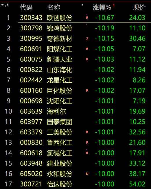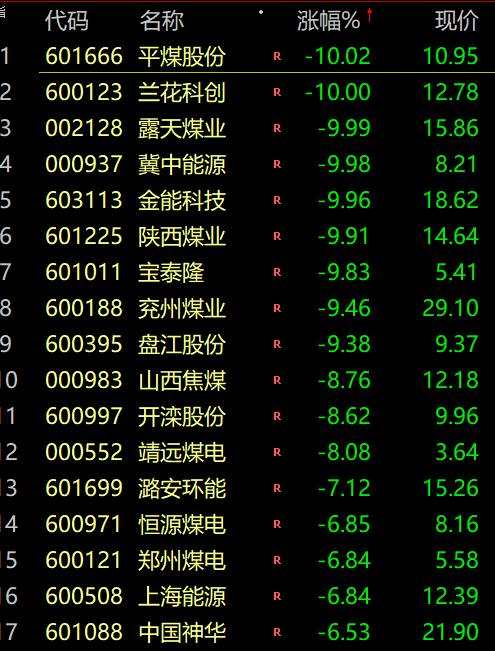 周期股出現(xiàn)跌停潮,煤炭、水泥、化工、鋼鐵等板塊指數(shù)跌超5%;蘭花科創(chuàng)(600123)、冀中能源(000937)、上峰水泥(000672)、鄂爾多斯、【三美股份(603379)、股吧】(603379)、氯堿化工(600618)等多股跌停。