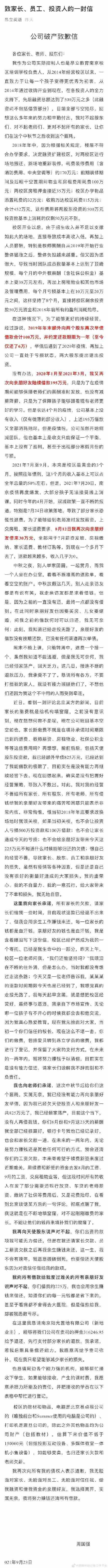 9月23日,南京昂立英語起航實(shí)際控股人、【昂立教育(600661)、股吧】(600661)南京校區(qū)培訓(xùn)學(xué)校負(fù)責(zé)人周國(guó)強(qiáng)在昂立英語微信公眾號(hào)平臺(tái)發(fā)布《致家長(zhǎng)、員工、投資人的一封信》,正式宣告公司破產(chǎn),并表示將用余生償還債務(wù)。 懇請(qǐng)周邊各個(gè)能力強(qiáng)的機(jī)構(gòu),能夠幫忙接收下學(xué)生,如果能夠接收,產(chǎn)生的課時(shí)費(fèi),周國(guó)強(qiáng)愿意承擔(dān)力所能及的責(zé)任。
