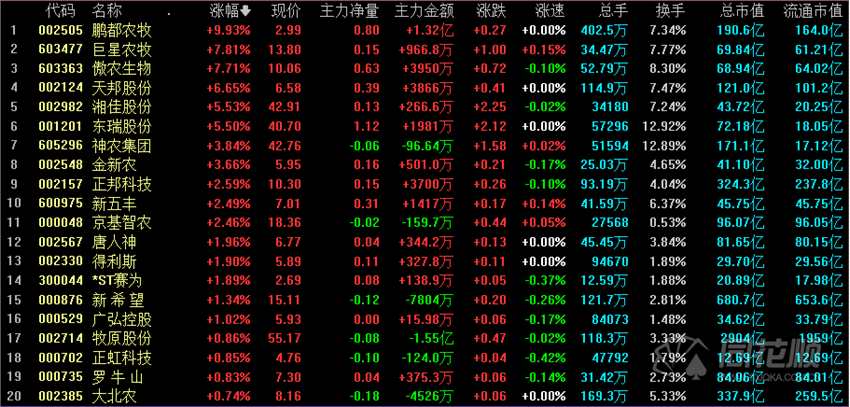 10月11日豬肉概念上漲,鵬都農(nóng)牧(002505)、巨星農(nóng)牧(603477)、【傲農(nóng)生物(603363)、股吧】(603363)、天邦生物、湘佳股份(002982)、東瑞股份(001201)漲幅居前。