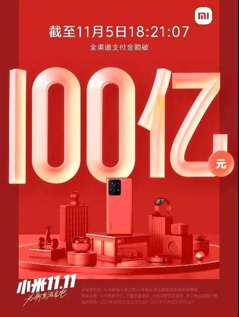 截至11月5日18時21分,小米“雙11”全渠道支付金額已破100億元,手機(jī)品類獲得天貓、京東、蘇寧易購(002024)、抖音等多個平臺銷量第一。