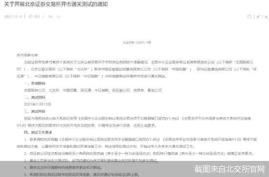 11月11日,北交所在官網(wǎng)發(fā)布通知表示,將于11月13日開展開市通關測試。