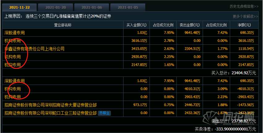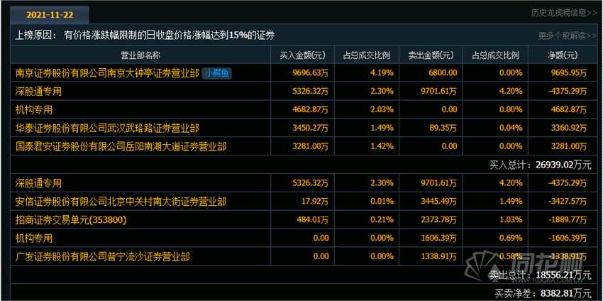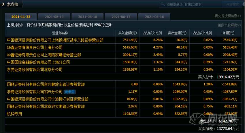 聚燦光電,龍虎榜數據顯示,買方方面,中國銀河(601881)證券股份有限公司上海楊浦區(qū)靖宇東路證券營業(yè)部、華鑫證券有限責任公司上海分公司、分別買入7500萬、5100萬。賣方方面,【國聯(lián)證券(601456)、股吧】(601456)股份有限公司宜興解放東路證券營業(yè)部、浙商證券(601878)股份有限公司紹興分公司(趙老哥)。