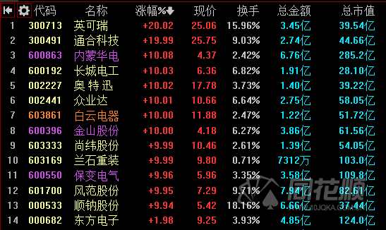 今日早盤電力建設(shè)相關(guān)概念股再度活躍走強(qiáng),截至午間收盤,綠色電力、智能電網(wǎng)、特高壓等板塊集體走高,金山股份、風(fēng)范股份(601700)5連板漲停,內(nèi)蒙華電(600863)、東旭藍(lán)天(000040)、【保變電氣(600550)、股吧】(600550)等超10股漲停。