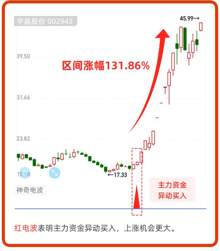 例如宇晶股份,在2021年11月09日出現(xiàn)紅電波后,上漲趨勢(shì)明顯,11月15日該股主升浪開啟,資金關(guān)注集中,放量上漲,一個(gè)月內(nèi)漲幅超100%!