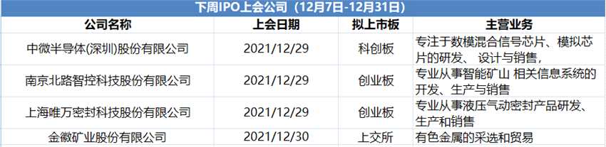 截至截稿時(shí)間12月17日,信息披露顯示,下周有4家公司將上會(huì)。其中,科創(chuàng)板:中微半導(dǎo)體(深圳)股份有限公司;創(chuàng)業(yè)板:南京北路智控科技股份有限公司、上海唯萬密封科技股份有限公司;滬市主板:金徽礦業(yè)股份有限公司。
