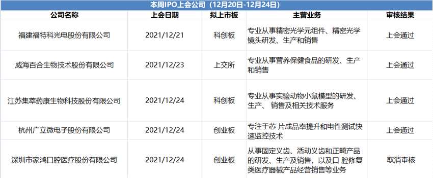 本周共有5家公司上會(huì),科創(chuàng)板2家,創(chuàng)業(yè)板2家,上交所主板1家。從審核結(jié)果來看,深圳市家鴻口腔醫(yī)療股份有限公司被取消審核,其他公司則“闖關(guān)”成功。