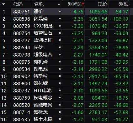 概念股方面,熱門的鋰礦、多晶硅、CXO概念(醫(yī)療)、光伏、鋰電池等跌幅居前,跌勢慘重;行業(yè)板塊,醫(yī)療保健、電氣設(shè)備、半導(dǎo)體、有色、釀酒等跌幅不小。