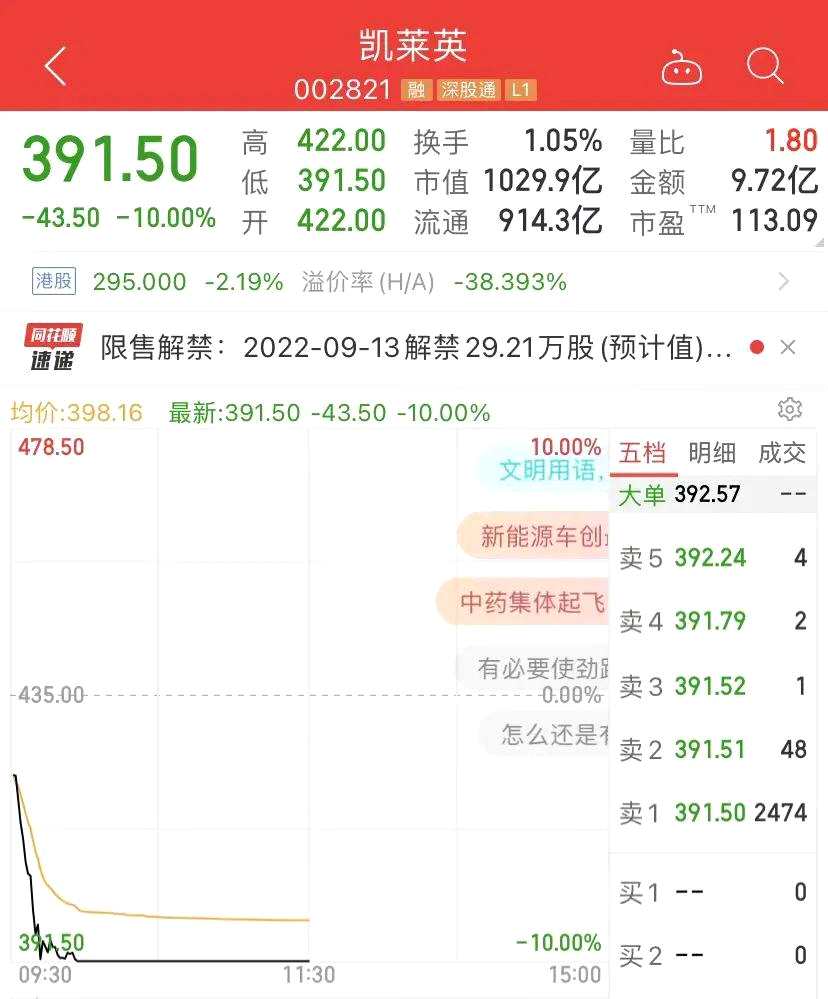 熱門的醫(yī)療CXO概念龍頭股,千億市值的凱萊英早盤開盤就閃崩跌停,而該股的H股早盤還一度上漲。凱萊英是只大牛股,過去幾年的十倍大牛股。