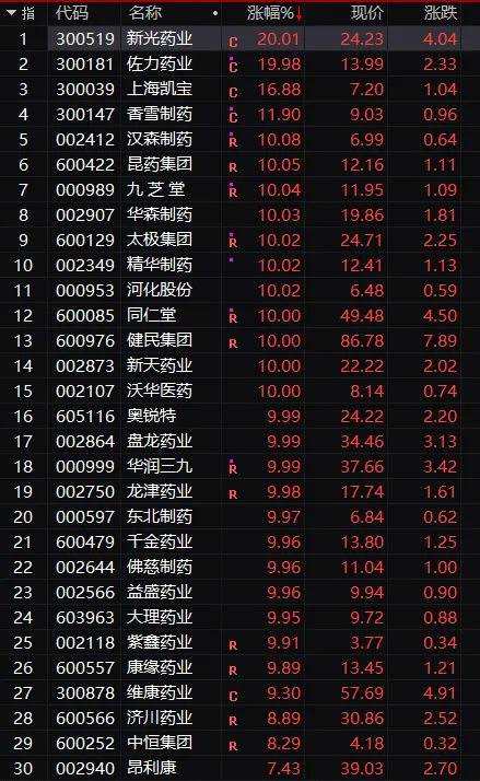 中藥股掀起漲停潮。板塊中新光藥業(yè)(300519)、佐力藥業(yè)(300181)20CM漲停,上海凱寶(300039)、香雪制藥(300147)漲超10%,另有漢森制藥(002412)、昆藥集團(600422)、九芝堂(000989)、華森制藥(002907)等約20只個股漲停。