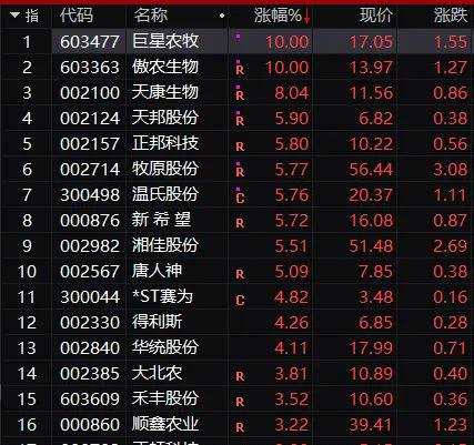 豬肉股漲勢兇猛,巨星農(nóng)牧(603477)、【傲農(nóng)生物(603363)、股吧】(603363)漲停,天康生物(002100)、天邦股份(002124)、正邦科技(002157)等都大漲。