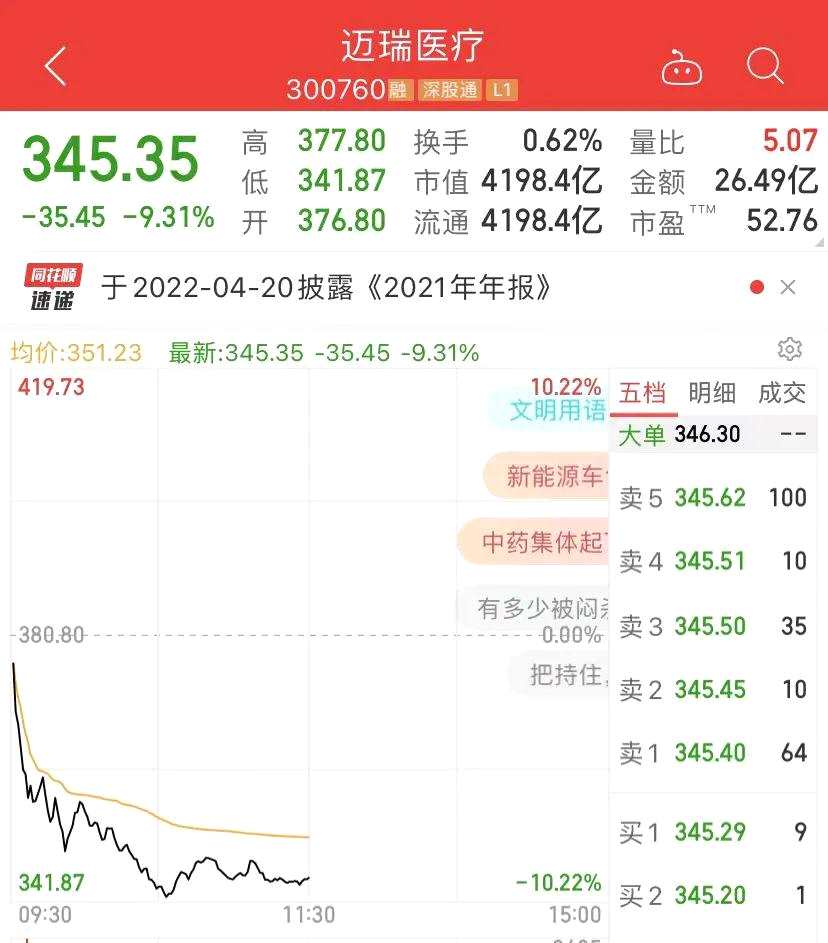4000多億的醫(yī)療茅邁瑞醫(yī)療(300760)也暴跌,跌幅逾9%,逼近跌停。
