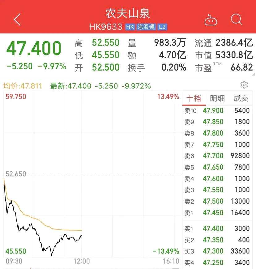5000多億水茅農(nóng)夫山泉盤中跌超13%