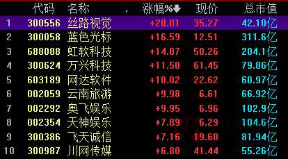 虛擬數(shù)字人板塊今日大漲,絲路視覺(jué)(300556)20%漲停,萬(wàn)興科技(300624)、藍(lán)色光標(biāo)(300058)、虹軟科技均漲超10%,【網(wǎng)達(dá)軟件(603189)、股吧】(603189)、云南旅游(002059)等漲停。