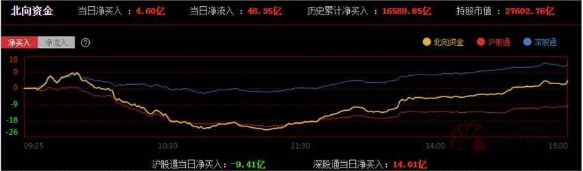 4、北向資金方面,滬股通全天凈賣(mài)出9.41億,深股通全天凈買(mǎi)入14.01億。