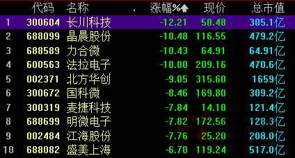 芯片賽道中,北方華創(chuàng)(002371)盤(pán)中觸及跌停,長(zhǎng)川科技(300604)、【晶晨股份(688099)、股吧】跌超10%。