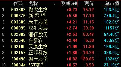 豬肉今日走強,傲農(nóng)生物(603363)漲8.23%,新希望(000876)漲超5%,雙匯發(fā)展(000895)、【正邦科技(002157)、股吧】(002157)、溫氏股份(300498)、牧原股份(002714)等跟漲。