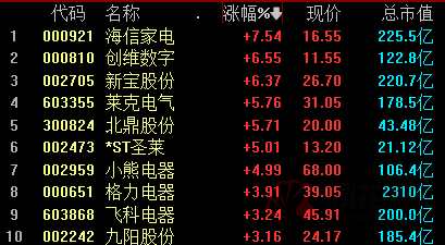 家電板塊今日也走強,【海信家電(000921)、股吧】(000921)漲7.54%,創(chuàng)維數(shù)字(000810)均漲逾6%,2000億市值的格力電器(000651)一度大漲5%,美的集團(000333)、飛科電器(603868)等也紛紛上漲。