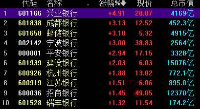 1月5日,三大指數(shù)走弱,銀行板塊扛起護盤大旗,板塊中個股普遍飄紅,興業(yè)銀行(601166)大漲4.9%,成都銀行(601838)、平安銀行(000001)、寧波銀行(002142)等跟漲。